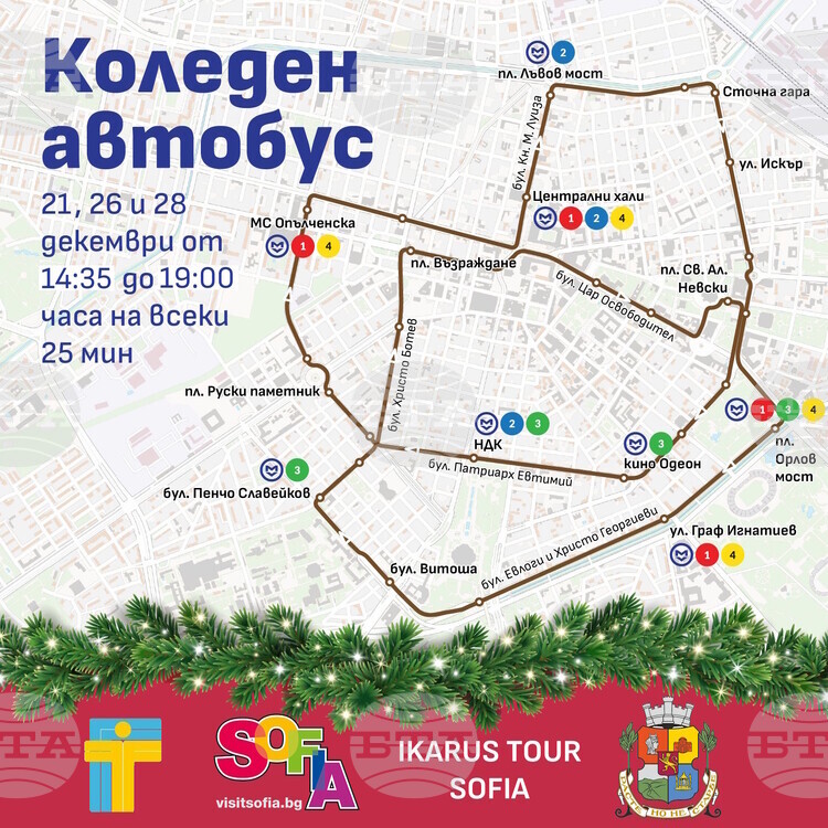 „Коледният автобус“ ще работи в следобедните часове – от 14:35 до 19:10 ч., на интервал от 25 минути, като всяка обиколка ще продължава около един час. Пътуването е безплатно, до изчерпване на местата.