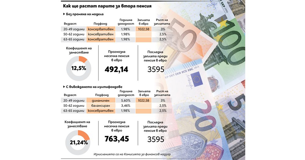 492,14 евро ще е размерът на втората пенсия за човек, който в момента работи на заплата 1022 евро, ако бъде запазена сегашната система на универсалните пенсионни фондове, при която всички пари се инвестират консервативно. При въвеждането на мултифондовата система пенсията на същия човек става 763,43 евро, или над 1,5 пъти по-голяма.