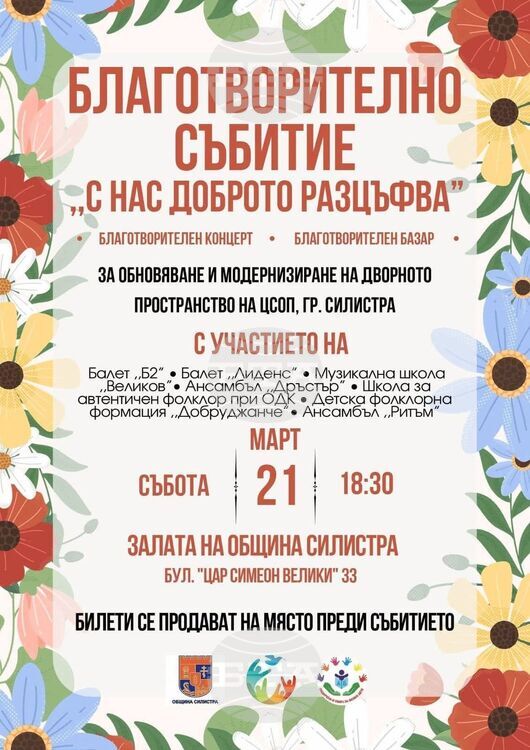 Благотворителен концерт под наслов „С нас доброто разцъфва“ ще събира средства за Центъра за специална образователна подкрепа (ЦСОП) в Силистра. Събитието ще се състои утре в залата на Общината Силистра, съобщиха от местната администрация с публикация във Фейсбук.