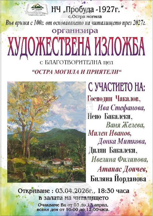 В навечерието на великденските празници за трета поредна година Народно читалище “Пробуда – 1927 г.“ в старозагорското село Остра могила организира благотворителна художествена изложба под надслов „Остра могила и приятели“. Това съобщиха от пресцентъра на Община Стара Загора.
