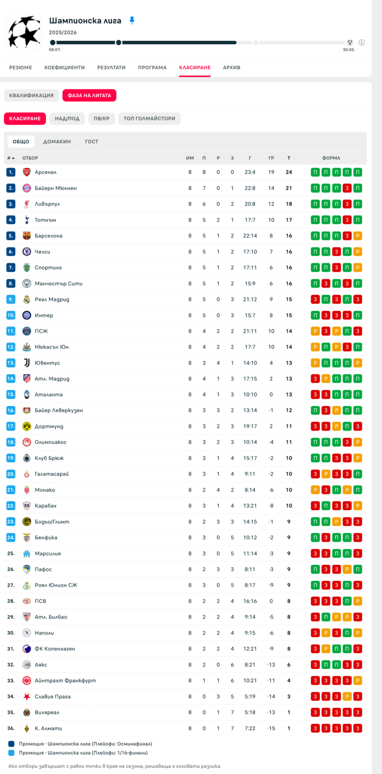 Единствените сигурни в топ 8 бяха Арсенал и Байерн Мюнхен, които съответно финишираха на първо и второ място в подреждането. Важно е да се отбележи, че тези отбори директно продължават напред, избягвайки допълнителните елиминационни плейофи, които очакват тимовете, завършили между 9-о и 24-о място.