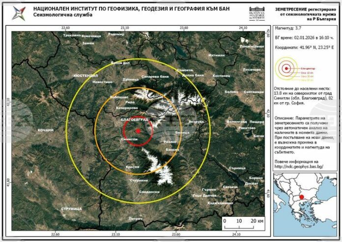 Второ земетресение – с магнитуд 3,4 по скалата на Рихтер, е регистрирано в Благоевградско