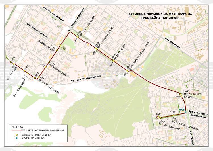 Трамвайна линия № 8 ще се движи по следния маршрут – от „Люлин 5“ по действащия маршрут до кръстовището на бул. „Вардар“ и бул. „Александър Стамболийски“, след което по бул. „Александър Стамболийски“ по маршрута на трамвайна линия № 10 до ж.к. „Западен парк“.