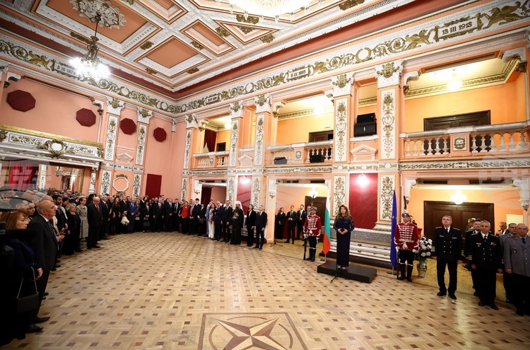 Президентът благодари на присъстващите, че са на приема и посочи, че присъствието им означава много. Тя благодари и на служебния премиер Андрей Гюров, както и на началника на отбраната адмирал Емил Ефтимов, че е отделил от времето си „в тези смутни и опасни времена“.