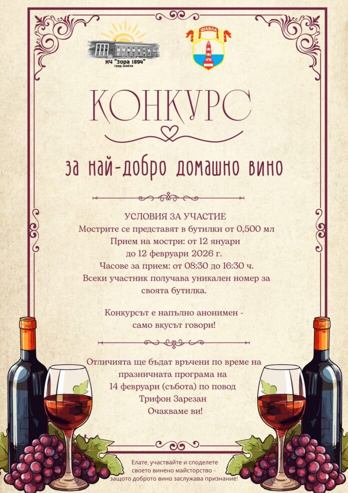 По повод празника на лозаря ТРИФОН ЗАРЕЗАН, Община Шабла и Народно читалище „Зора 1894“ – гр. Шабла организират конкурс за най-добро домашно бяло и червено вино от реколта 2025 г.