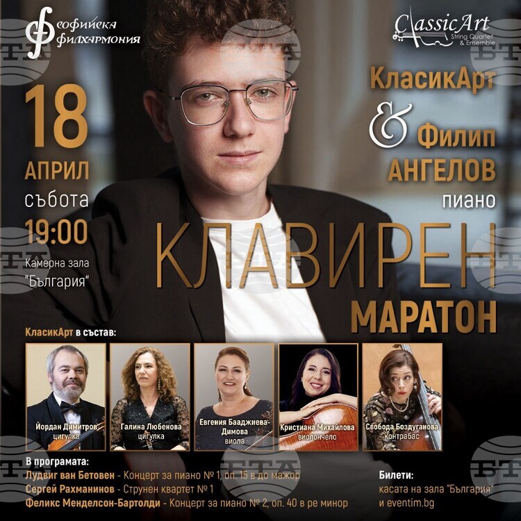 Музиканти от състав „КласикАрт“ и пианистът Филип Ангелов ще изнесат концерт, озаглавен „Клавирен маратон“, в камерна зала „България“. Събитието ще се състои от 19:00 ч. на 18 април, съобщават организаторите от екипа на Софийската филхармония.