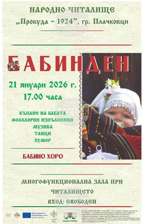 Обичаят „Къпане на бабата“ ще бъде пресъздаден в Плачковци. Това съобщиха организаторите. Събитието ще се състои на 21 януари от 17:00 ч. в многофункционалната зала към Народно читалище „Пробуда – 1924“, град Плачковци.