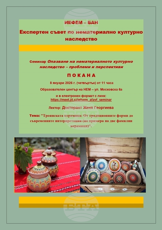 Експертният съвет по нематериално културно наследство към Институт за етнология и фолклористика с Етнографски музей – БАН (ИЕФЕМ – БАН) организира семинар на тема „Опазване на нематериалното културно наследство – проблеми и перспективи“. Събитието ще се проведе на 8 януари от 11:00 ч. и ще бъде с фокус „Троянската керамика: от традиционните форми до съвременните интерпретации (по примера на две фамилии керамици)“, съобщават организаторите.