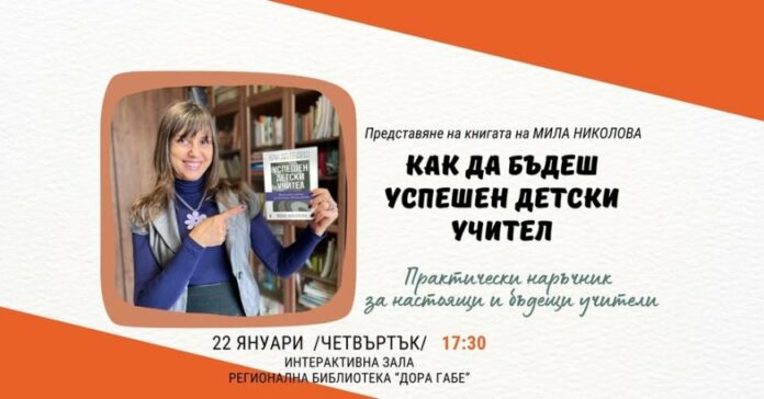 На 22 януари 2026 г. /четвъртък/, от 17.30 ч. в Интерактивната зала на Регионална библиотека „Дора Габе“ ще се състои премиера на книгата на Мила Николова „Как да бъдеш успешен детски учител“- Практически наръчник за настоящи и бъдещи учители.