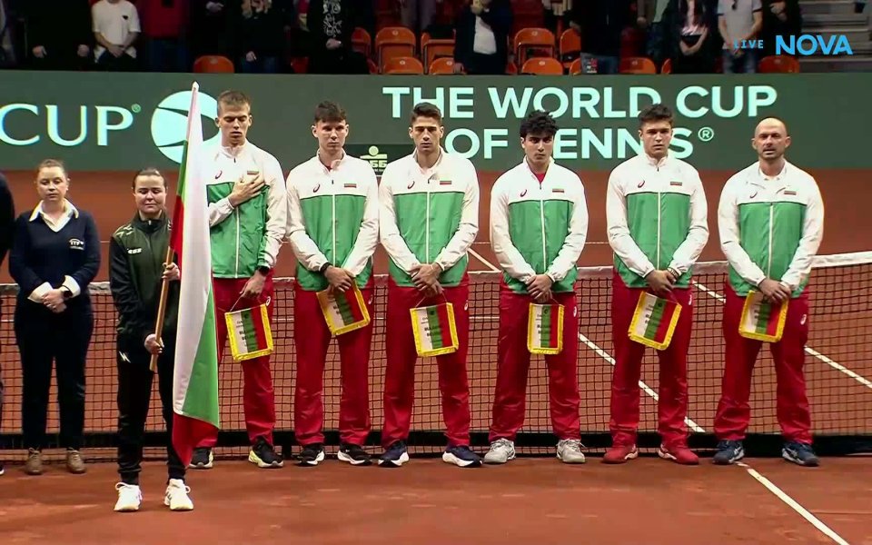 Българските национали и техните съперници от Белгия излязоха на корта под бурните аплодисменти на феновете по трибуните в сблъсъка за Купа Дейвис. Веднага след официалното представяне на състезателите в залата прозвучаха националните химни на двете държави.