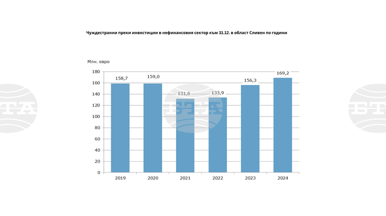 По данни на Националния статистически институт преките чуждестранни инвестиции (ПЧИ) в нефинансовия сектор в област Сливен към 31.12.2024 г. възлизат на 169,2 млн. евро, което е с 8,3 на сто повече в сравнение с 2023 година. Това съобщи Сребрина Ганушева, главен експерт в Териториалното статистическо бюро „Югоизток“ към Националния статистически институт (НСИ).