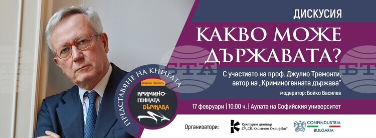 Проф. Джулио Тремонти ще представи днес книгата си „Криминогенната държава“ от 10:00 ч. в аулата на Софийския университет „Св. Климент Охридски“, съобщиха от Културния център на Софийския университет.