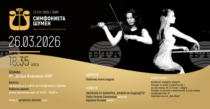 Под диригентството на Любомир Александров на сцената ще излязат лауреати от конкурса „Орфей на бъдещето“ – Люба Калина Симеонова (цигулка) и Адриана Кънева (пиано). Програмата е изцяло посветена на Волфганг Амадеус Моцарт и включва концерт за пиано и оркестър № 1 във фа мажор, KV 37 (III част – Allegro), концерт за цигулка и оркестър № 3 в сол мажор и Симфония № 37, отбелязаха от Симфониетата в Шумен.
