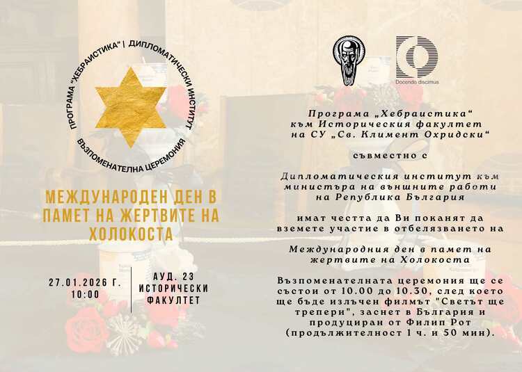 Програма „Хебраистика“ към Историческия факултет на Софийския университет „Св. Климент Охридски“ и Дипломатическият институт към Министерството на външните работи ще отбележат Международния ден в памет на жертвите на Холокоста – 27 януари, съобщиха от висшето училище.