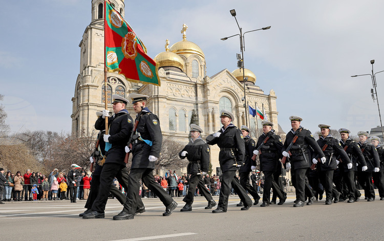 С вдигане на националния флаг с военен ритуал започнаха тържествата по случай Трети март във Варна. Официалната церемония уважиха областният управител Атанас Михов, кметът Благомир Коцев, председателят на Общинския съвет Христо Димитров, народни представители, общественици, офицери и много граждани. Строят на представителните части на Варненския гарнизон бе приет от командира на Военноморските сили на България контраадмирал Кирил Михайлов.