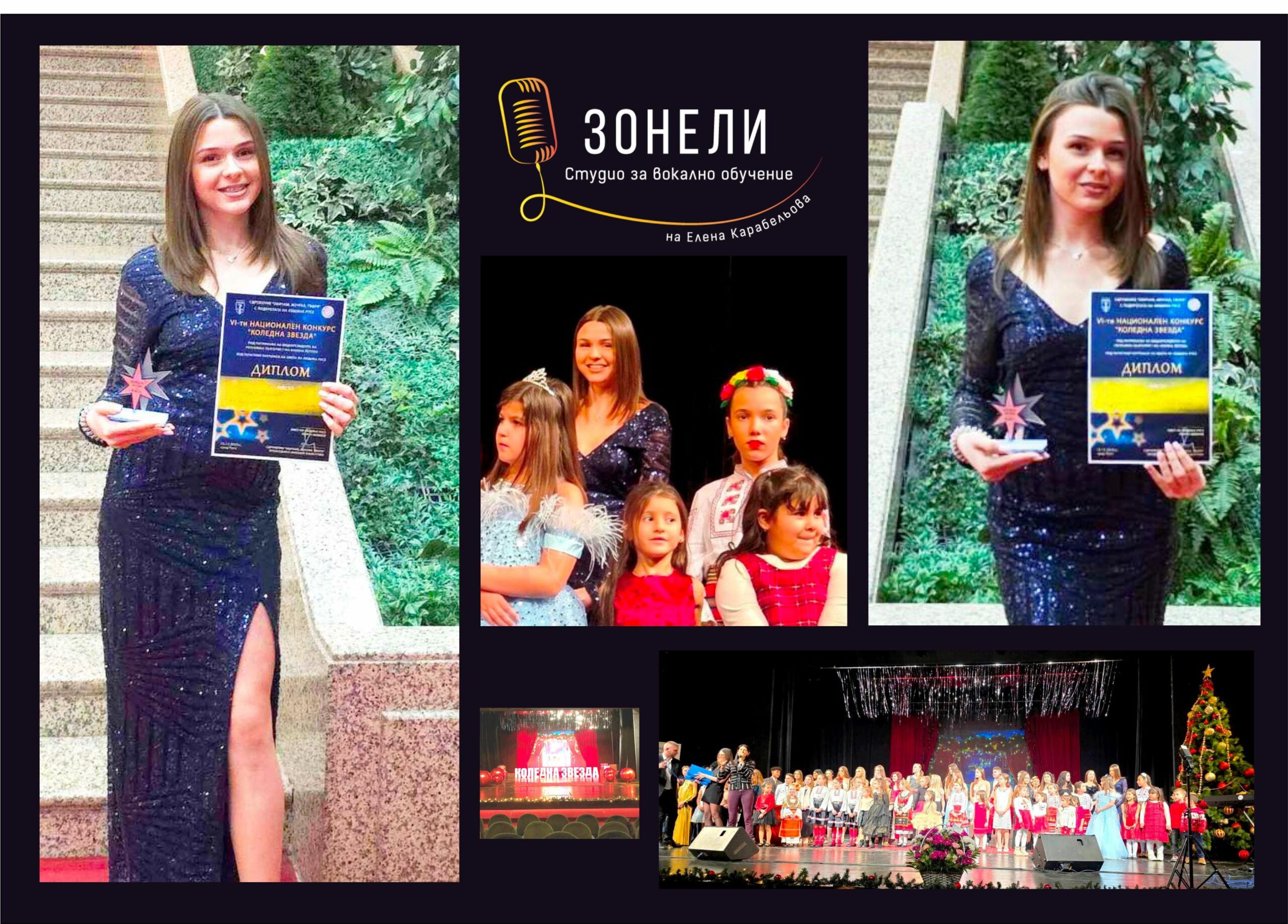 Теодора Велинова от Студио за вокално обучение „Зонели“ – Добрич взе участие в VI Национален конкурс „Коледна звезда“2025 – Русе, който се проведе на 13-ти декември – събота. Тя се представи с българска песен в пета възрастова група (16 – 19 години) и грабна трета награда.