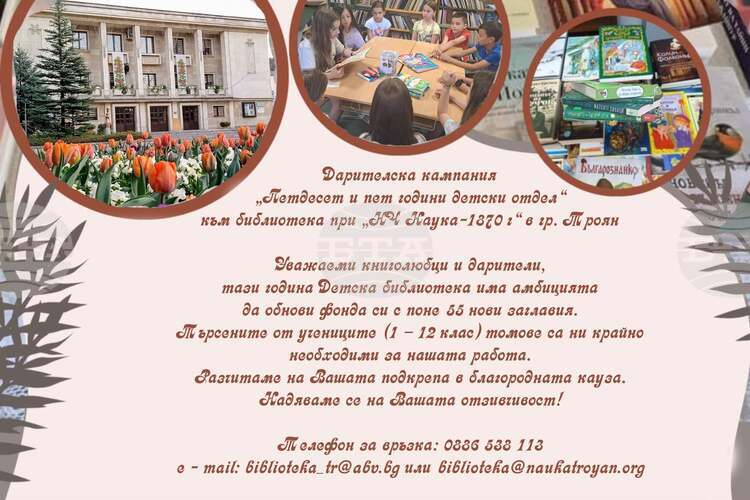 Народно читалище „Наука – 1870 г.“ в Троян обяви дарителска кампания по повод 55-годишнината от създаването на детския отдел към градската библиотека, съобщи за БТА Весела Йорданова, отговорник за отдела.