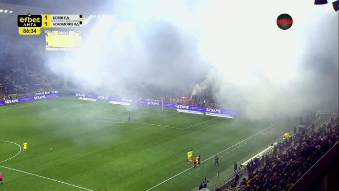 Запалените факли и димки от феновете на Ботев Пд прекъснаха срещата с Локомотив Пд от 29 кръг на efbet Лига за няколко минути в самия край на битката на стадион „Христо Ботев“ при резултат 1:1.