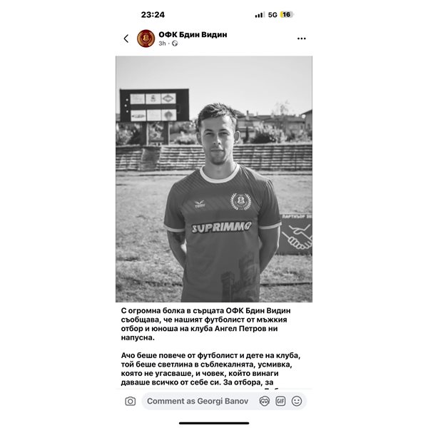 „С огромна болка в сърцата ОФК „Бдин“ /Видин/ съобщава, че нашият футболист от мъжкия отбор и юноша на клуба Ангел Петров ни напусна.